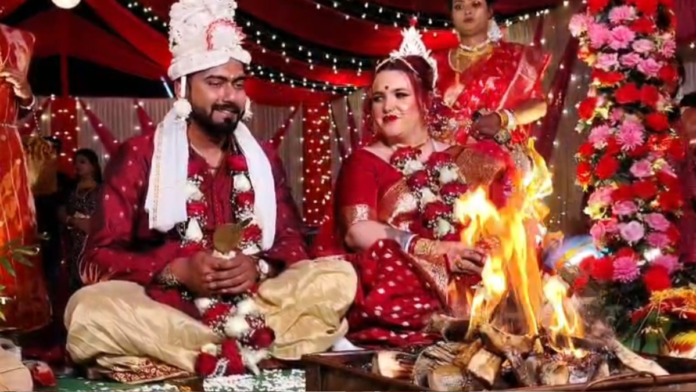 Aaj India Desk, উত্তর ২৪ পরগণা : শঙ্খধ্বনি, উলুধ্বনির মাঝে একেবারে চেনা বাঙালি বিয়ের আয়োজন। কিন্তু উত্তর ২৪ পরগনার হাবরার (Habra) সেই পরিচিত আসরের মাঝেই ছিল ভিন্ন মাত্রা। বাঙালি বিয়ের আসরের কনে এবার খোদ লন্ডনের ‘রয়্যাল’ !
