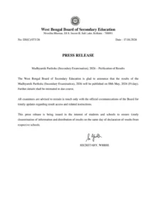 তবে ফল প্রকাশের নির্দিষ্ট সময় এখনও জানানো হয়নি। কোন সময়ে অনলাইনে ফল দেখা যাবে, সকাল থেকে নাকি দুপুরে সেই বিষয়টি পরে বিস্তারিতভাবে জানাবে পর্ষদ। একই সঙ্গে কোন কোন ওয়েবসাইটে ফলাফল পাওয়া যাবে, সেই তথ্যও আলাদা করে জানানো হবে বলে সূত্রের খবর। ফল প্রকাশ ঘিরে ইতিমধ্যেই পরীক্ষার্থী ও অভিভাবকদের মধ্যে তৈরি হয়েছে তীব্র আগ্রহ ও অপেক্ষা। এখন নজর ৮ মে-র দিকে কখন খুলবে ফল দেখার লিঙ্ক, তা নিয়েই চলছে জল্পনা।
