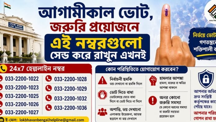 Aaj India Desk, কলকাতা: আগামীকাল শুরু হচ্ছে পশ্চিমবঙ্গের বিধানসভা নির্বাচনের প্রথম দফার ভোটগ্রহণ প্রক্রিয়া। আর এই নির্বাচন প্রক্রিয়াকে সামনে রেখে ভোটারদের নিরাপত্তা সুনিশ্চিত করতে ও সুষ্ঠুভাবে ভোট গ্রহণ সম্পন্ন করার সুবিধার্থে একাধিক হেল্পলাইন নম্বর চালু করল লোক ভবন। 24 ঘন্টাই রাজ্যবাসীদের জন্য খোলা থাকবে এই হেল্পলাইন পরিষেবা।