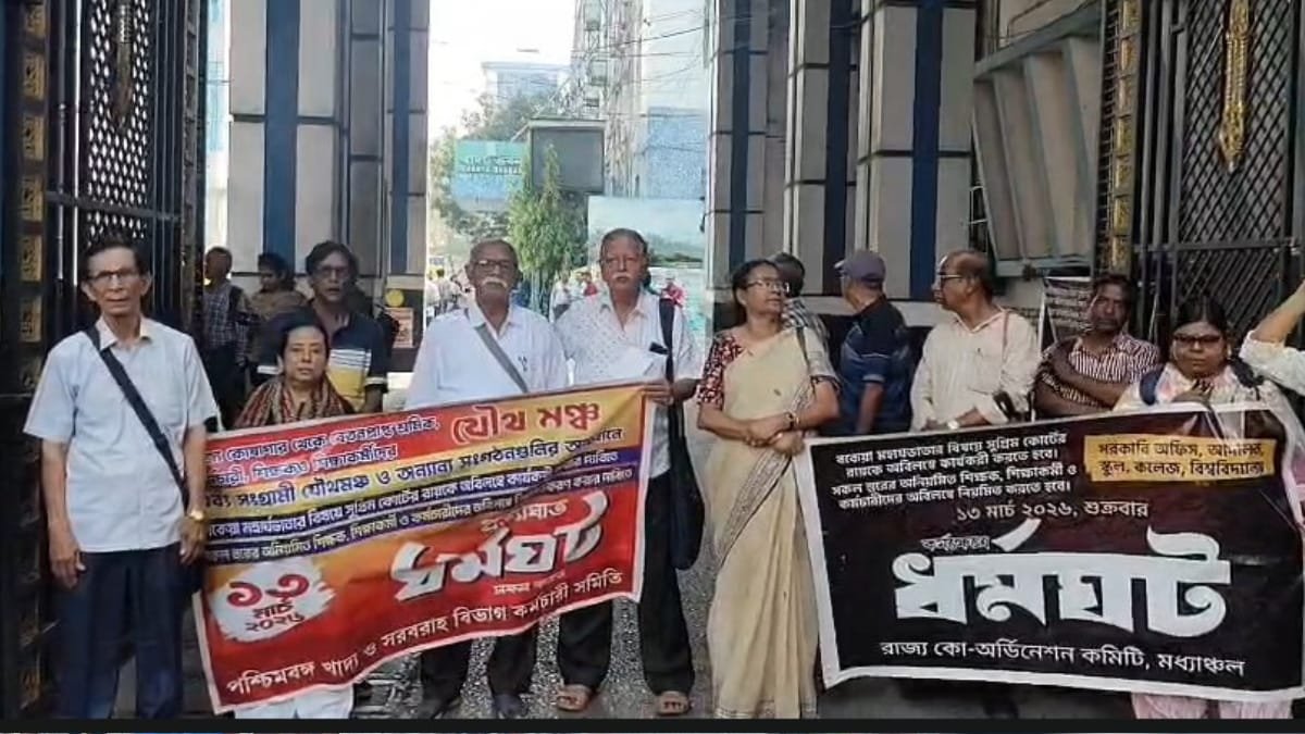 সংগ্রামী যৌথ মঞ্চের দাবি, সুপ্রিম কোর্ট (Supreme Court) ও হাইকোর্টের নির্দেশ মেনে রাজ্য সরকার (State Government) কে দ্রুত প্রাপ্য ডিএ (DA) দিতে হবে। পাশাপাশি যোগ্য অনিয়মিত কর্মীদের স্থায়ীকরণসহ একাধিক দাবি সামনে রেখে ১৩ মার্চ ধর্মঘটের ডাক দেওয়া হয়েছে। ধর্মঘটকে সফল করতে সকাল থেকেই বিভিন্ন সরকারি দপ্তরের সামনে অবস্থান বিক্ষোভে সামিল হন আন্দোলনকারীরা। দপ্তরে কাজে যোগ দিতে আসা কর্মী ও আধিকারিকদের ধর্মঘটে সামিল হওয়ার আবেদনও জানানো হয়।