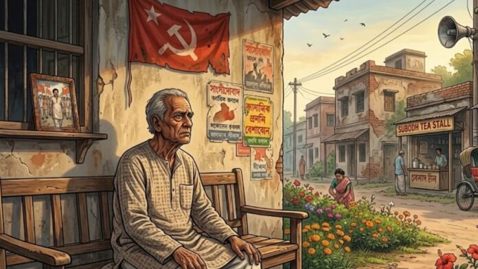 মুর্শিদাবাদের গণেশপুরের একপ্রান্তে, ছোঁয়াচে স্মৃতির ধুলো জমেছে জীর্ণ বাড়ির দেওয়ালে। সেখানে বসে আছেন ষাটোর্ধ গোপালকৃষ্ণ সাহা, যিনি ছাত্রজীবন থেকে বামপন্থী (Left Front) রাজনীতির সঙ্গে জড়িত। একসময় মাঠে ঘাটে ঘুরে গা ঢাকা দিয়ে লাল পতাকা উত্তোলন করেছিলেন তিনি, হাতে কাস্তে-হাতুড়ি চিহ্নের সঙ্গে আত্মার এক অদৃশ্য সম্পর্ক নিয়ে। আজ সেই সময়ের আবহ না থাকলেও, গোপালকৃষ্ণের চোখে লাল সেলামের দীপ্তি এখনও অম্লান।